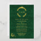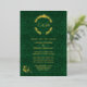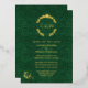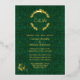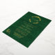 Ornate gold foil wedding invitation done in an elegant green damask with a gold foil floral wreath decoration, at the top, with the couple's monograms. Personalize the foil text to suit your wedding needs.