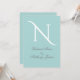 Robin egg blue background with a fresh white monogram. The bride and groom names on the front are in a subtle grey. Invite typography on the reverse of this beautiful invitation is also in grey to match the front of this invite. The font is a fancy script. Just gorgeous. 100% customer satisfaction guaranteed with “Zazzle”.