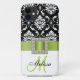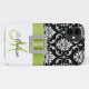 Stylish Black and White Damask Pattern iPhone 5 Case-Mate Case with a photo print of a lime green satin ribbon, square brooch with photo print of white diamonds. Personalize this elegant iPhone 5 Case with your name and monogram initial at the bottom of the design on a white background. Makes a great fashion accessory for your iPhone 5. Elke Clarke© Graphics licensed.