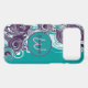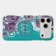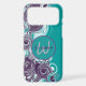 The phone case design features a spiral wave in white and shades of purple with an initial letter monogram centred on it. Personalize the template field with your information, remove one text element or edit using the design tool to select a font style, size, and colour you prefer.