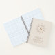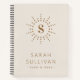 Elegant notebook with your monogram initial inside a border of radial dots resembling a sun on light neutral/ivory background. Below is a teplate field for your name and one line of custom text. Colours can be customized with the design tool.