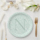 Pretty pastel green damask paper plates. Damask background with sage green and monogram.