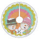A snowman in a top hat, a snowman in a pink winter hat and striped scarf, a background of white polka dots on mustard, aqua blue, pink, and orange with a white star that you can easily customize with your monogram initial! This pretty snowman Christmas tree skirt will be a treasured item year after year!