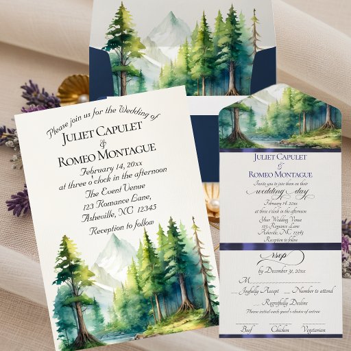 The Monogram Initials Wedding Invitation Belly Band features leaf monogram frames intertwined, each with a first initials on an emerald background. Personalize with the bride & groom's initial. Designed to coordinate with the Watercolor Mountain Wedding Invitation Collection. To change details, click «Personalize». To move the text or change the text size, font, or colour click «Click to customize further»