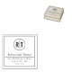 Elegant return address rubber stamp featuring your monogram initials separated by a vertical line inside a circle border with name and address below. A modern, minimal design with a thin square border.