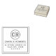 Elegant return address rubber stamp featuring your monogram initials separated by a vertical line inside a circle border with name and address below. A modern, minimal design with a thin square border.
