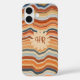 Trendy retro stripes 70s watercolor groovy wave design theme for a personalized customized iPhone case. With initial letters, initials, monogram. Fashionable accessory to protect your cellphone or a creative thoughtful original gift for her. It will surely be appreciated and admired. The colour scheme is specific, retro sunset vibes, boho terracotta, orange, cream, beige, grey, blue.