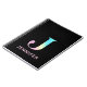 Chic personalized black notebook with a "J" initial monogram in large bold type with a pink, yellow, mint green and teal blue rainbow gradient. Add your name below in simple pink typography.