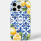 Monogram Lemon Citrus Fruit Elegant Mediterranean iPhone 15 Pro Max Case features bright yellow watercolor lemons and green leaves layered over a classic blue and white Mediterranean tile background. Centred with a clean monogram, it brings stylish Positano and Amalfi Coast vibes to your everyday essentials. A fresh, personalized look perfect for summer or spring.