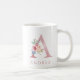 A floral personalized coffee mug with a name and rose pink monogram letter "A", and with a decorative watercolor foliage and flowers.