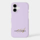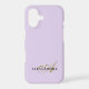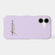 Trendy chic elegant personalized iPhone case in soft pastel purple lavender lilac background, gold elegant calligraphy handwritten monogram initial letter and stylish black custom name text typography. Minimal modern minimalist monochromatic premium look tech accessory to protect your cellphone. Great fashionable electronic accessory to be used for the personal mobile phone or professional business cellular. Beautiful and useful feminine girly pretty custom gift for her, at a very affordable price, under 35 dollars.