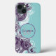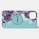 The phone case design features a spiral wave in white and shades of purple with an initial letter monogram centred on it. Personalize the template field with your information, remove one text element or click customize to select a font style, size, and colour you prefer. In customize, you can also select a colour other than teal for the background.