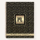 A faux gold foil square with a black script monogram initial and custom name on a gold band, overlaying a luxury gold oblong dots pattern on black, highlight this chic, girly, modern monogramed spiral journal notebook. 8 different inside paper designs to choose from. Makes a stylish statement every time you use it. A great gift for a friend, as well as yourself!