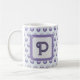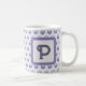 This monogram mug is a great way to add a personalized touch to your morning routine. A blue grey polka dot pattern appears against a light blue background along with the letter "P" featured in a square. The letter can quickly and easily be personalized.