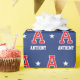 Elevate your gift-giving with monogrammed wrapping paper! This sports jersey-style pattern features a retro block font, stars, and is personalized with a monogram initial and the recipient's name. You can also customize the background colour by using the design editor tool. A stylish design that would suit many occasions, including Christmas, birthdays, graduations and more — perfect for all ages, from kids and teens to family and friends! This seamless gift wrap is available with a matte or glossy finish. Printed colours: red, dark blue navy and white.