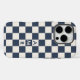 Cool iPhone case features a bold navy blue and cream chequered pattern with a customizable monogram. Add (or delete) 3 initials in the sidebar to personalize it. The geometric chequerboard pattern is made of rows of alternating beige and dark blue squares. Other case styles and models also available in the sidebar.