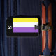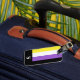 Luggage tag with the nonbinary pride flag, white monogram initial(s)/name on a black stripe monogram frame, name, and address information on a black background. Personalize with your monogram initial(s)/name, name, and address information using the easy templates. Font colour, font style, font size, and background colour are customizable. The perfect colours for travel.