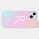 Monogram Ombre Holographic Pink Girly Personalized iPhone 15 Plus Phone Case features a pink and blue holographic background with your personalized monogram in the centre. Personalize by editing the text in the text boxes provided. Designed by ©Evco Studio www.zazzle.com/store/evcostudio