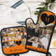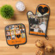 Add 12 family, kids, pets, or best friends photos and create your own trendy collage grid black and orange funny cute kitchen oven mitt and pot holder set with your personal or family monogram name and initial inside white hearts. +++++++++++ Easy to personalize with your custom square images, text and letters. It can be a nice thoughtful keepsake gift for a family member, friend, or coworker on a birthday, anniversary, Christmas, or any other occasion.