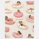 This seamless pattern features stylish women lounging on pink and white pool floats with heart accents, creating a relaxing and summery aesthetic. The design highlights a chic and carefree vibe, perfect for summer-themed projects, beach accessories, or poolside decor. Ideal for textiles, stationery, gift wrap, or digital designs, this pattern brings a fun and modern twist to summer-inspired creations. Perfect for those who love pool days, fashion, and relaxation.
