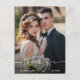 Elegant wedding thank you postcard featuring an edge-to-edge photo. Front of card includes a statement of thanks and the couple's names in mixed script and minimalist typography. Back of card contains a simple monogram divided by a botanical branch silhouette and a heartfelt message of thanks. Design is fully personalizable. Contact us for assistance in personalizing or customizing to your need.