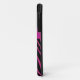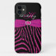 Monogrammed modern black and fuchsia pink FAUX glitter zebra print stripe pattern iPhone 5 Barely There Case-Mate brand case with PRINTED ribbon and PRINTED jewel brooch. Customize it to add your name, initial, or other text. If you need assistance, email niteowlstudio@gmail.com.