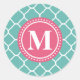 Monogram Pink Teal Blue Quatrefoil Pattern Classic Round Sticker