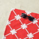 This custom made-to-order beach towel has features a geometric coral red and white tiled pattern with a personalized monogram at the base of the beach towel. Personalize by editing the text boxes provided.