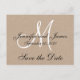 Elegant Monogram Rustic Save the Date postcard. Elke Clarke© for MonogramGallery at Zazzle. Modern, simple wedding announcement with printed beige kraft paper photo effect. A white monogram initial in script typography with black text overlay. Fully customizable. Other colours and background effects available.