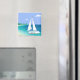 Monogram Sailboat Coastal Tropical Beach Magnet. A sailboat with your name on it approaching a beach. Tropical sea view. Blue, teal, sea foam, turquoise, green, white.