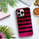 Create a unique personalized phone case with a pink and black striped pattern. Pink stripes imitate metallic surface. Text template makes it easy to customize the phone case with your name.