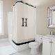Beige, black and white shower curtain with last name and initial with a black border and black initial. Background can be any colour, as can font. from HAMbyWhite Glove aka HAMbWG