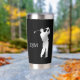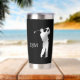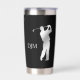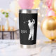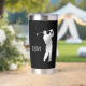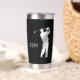 This thermal beverage tumbler features a silver silhouette golfer in full swing. Your monogram or name in matching silver is at the side of the image. The image and the text are placed on a dramatic black background, but you may change the colour by choosing to Customize the Design. Be sure to see the matching golf theme products in our store.