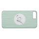 Dress up and protect your iphone with a modern striped pattern in teal and off white colours with a round circle design element that is custom monogrammed with your initial in a stylish Script font.