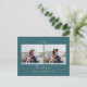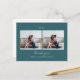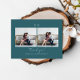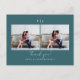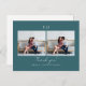 This modern minimalist teal and white wedding two photo thank you postcard features elegant hand lettering and a simple monogram with a custom personalized thank you message and return address on the back of the chic dark turquoise blue card.