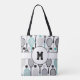 Sporty monogram tennis tote bag featuring a stylish pattern of tennis rackets and balls in black, grey, and teal. Perfect for tennis players, coaches, and fans to carry gear, snacks, or personal items to matches, practice, or tournaments. Customize with your initial or name for a personal touch. Makes a thoughtful gift for birthdays, team celebrations, or tennis-loving friends. Durable and versatile for both on and off the court.