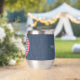 This modern 11 oz. stainless-steel thermal tumbler features a medium blue denim wrap with framed script initials on a red & white buffalo check circle pattern. Simple white script phrase is on the back. Change or remove initials and text using the Template provided. Double walled insulation for temperature retention. Stainless Steel construction for durability. The clear lid is leak-proof. Excellent printing and high reviews. See "About This Product" at side for more information.