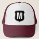 Monogram trucker hat with custom letter. Make your own cap in maroon red and other colours. Great idea for sports teams like baseball and softball. Personalized logo emblem shield with initial for men women and kids.