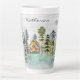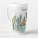 Introducing our Monogram Watercolor Rustic Forest Mountain Cabin Latte Mug. featuring a watercolor cabin nestled in a foggy green pine forest. Suitable for nature lovers.
