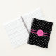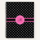 Monogrammed black and white polka dot pattern notebook. White polka dots on black and in the middle there is a black band with a hot pink border and a hot pink circle to put your monogram.
