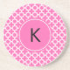 Monogrammed white on hot pink quatrefoil pattern sandstone coaster.