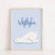 Cute initial monogram baby name on blue background and winter polar bear, perfect for kids nursery, children's room, bedroom, playroom and other room. personalized initial and monogram name and background colour. Gender neutral design for both boys and girls.