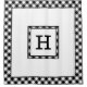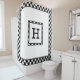 Custom shower curtain features a large, bold black monogram on a white background with a geometric frame of black, grey, and white triangles. The outer edge border features black, white, and grey diamonds in a buffalo check pattern. Add your initial in the sidebar.