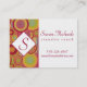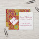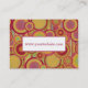 This business card features a sophisticated palette of reds, golds, greens, blues, and orange... with some subtle pops of deep pink. The left side of the front is covered with stripes embellished with bubble-like circles overlaid with a diamond-shaped badge with red border for adding your initial for monogram. Details are in red to the right, contrasting beautifully with the stark white background. The back is completely covered with the same multi-coloured circle/stripe abstract art as well as a red-bordered white rectangle which offsets the website address. These overlay elements can be removed if you prefer. The subtly-grunged texture adds depth and the abstract quality of this design makes it perfect for people in creative fields. The colourful background art design can be moved around, rotated or resized if you'd like to have a bit of control over the ultimate look of these cards. Likewise, change your fonts if you wish.