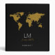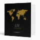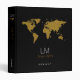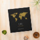A black binder with the image of a faux gold map of world, personalized with your own name, business or subject, initials, and subject