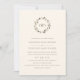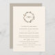 Beautiful fall wedding invitations feature tone on tone shades of tan, greige and umber with the couple's initials nestled in a watercolor botanical wreath. Cards reverse to solid greige.