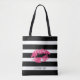 Simple black and white stripes and pink lips. Customizable tote bag template