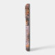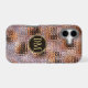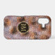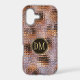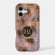 Cet élégant étui de téléphone présente votre monogramme de deux lettres en or pâle au centre d'une bannière en cercle noir qui est double encadrée en or. La bannière est placée sur un motif arrière - plan en dégradé qui ressemble à des segments de verre assemblés ensemble. Les couleurs utilisées sont la lavande, le violet, l'or et le noir.