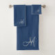 Serviette de bain monogrammed gris et blanc personnalisée avec une police de script sur un arrière - plan bleu marine. Une élégance simple. Rafraîchissez votre décor de salle de bain avec un style typographique minimaliste.