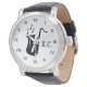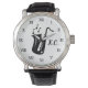 Monogrammed cadeau de montre pour lecteur saxophone. Pièce de temps personnalisée pour adultes et enfants. Numéros romains avec typographie de script stylisée et icône d'instrument sax plus notes de musique. Classy black bracelet en cuir. Logo noir et blanc élégant avec monogramme ou devis personnalisé. Idée cadeau unique de Noël ou d'anniversaire pour saxophoniste, enseignant, étudiant, musicien de jazz, mari, hommes, frère, fils, etc. Aussi agréable comme Fête des pères présent pour papa ou grand-père. Ajoutez vos propres initiales de nom monographique.